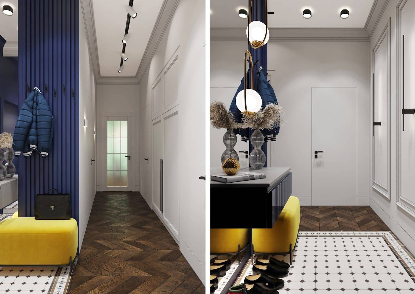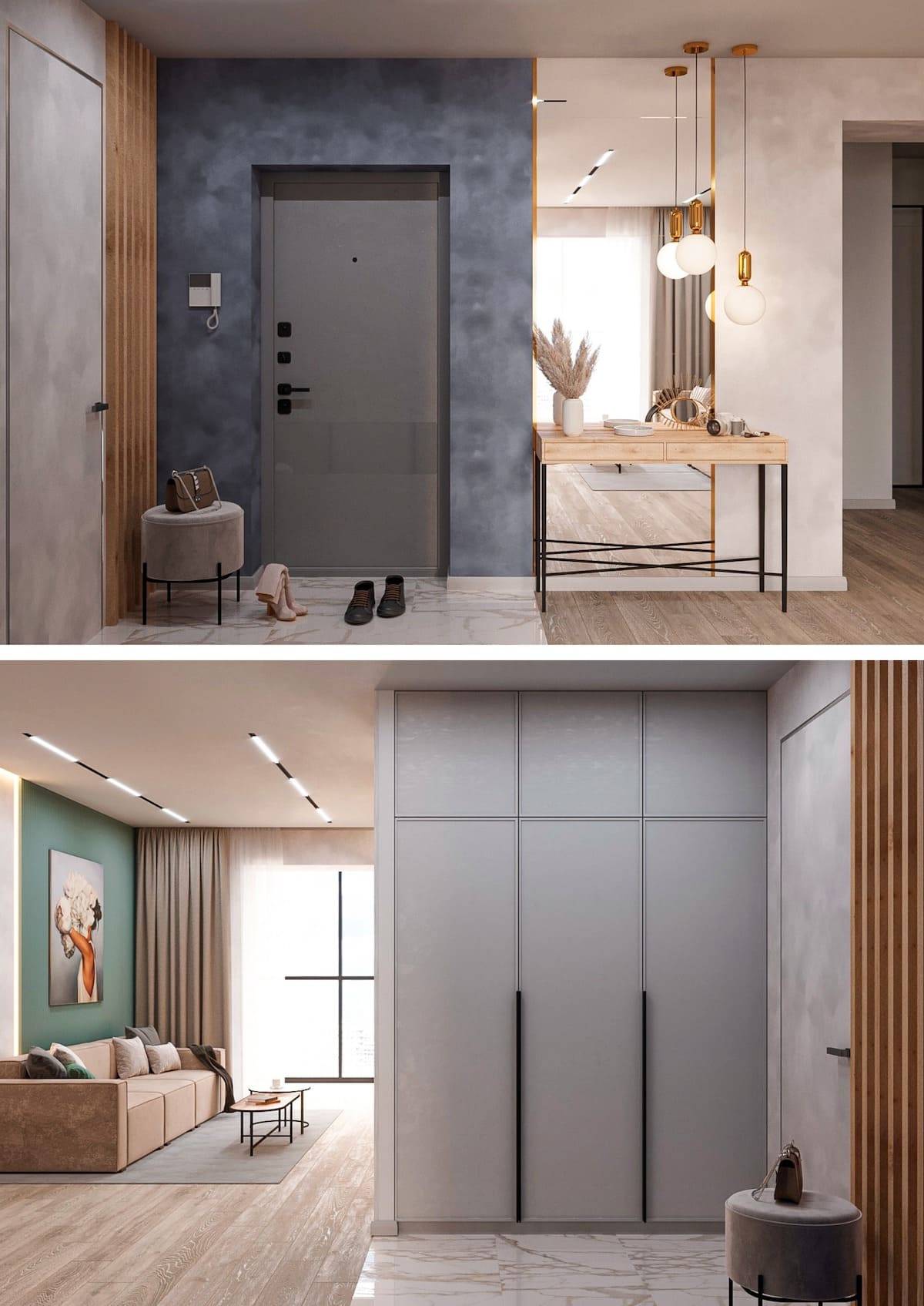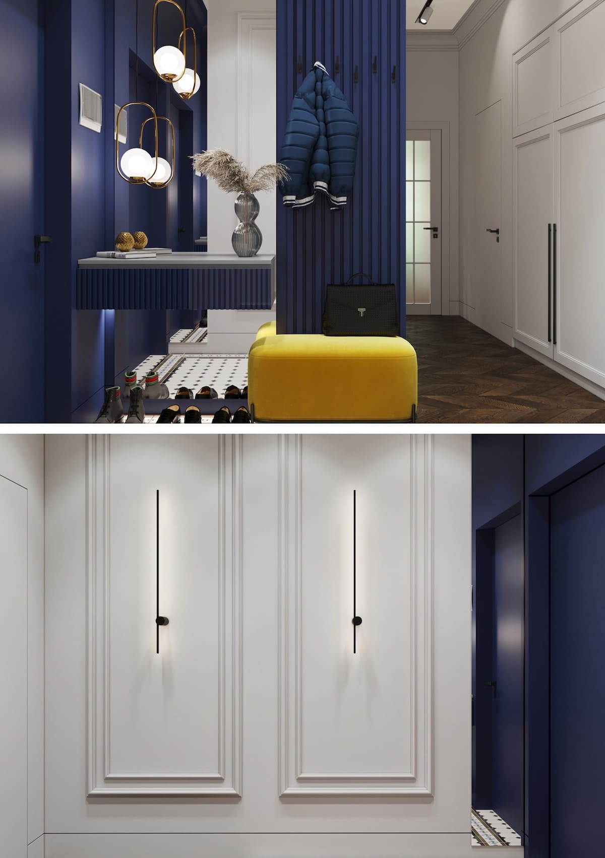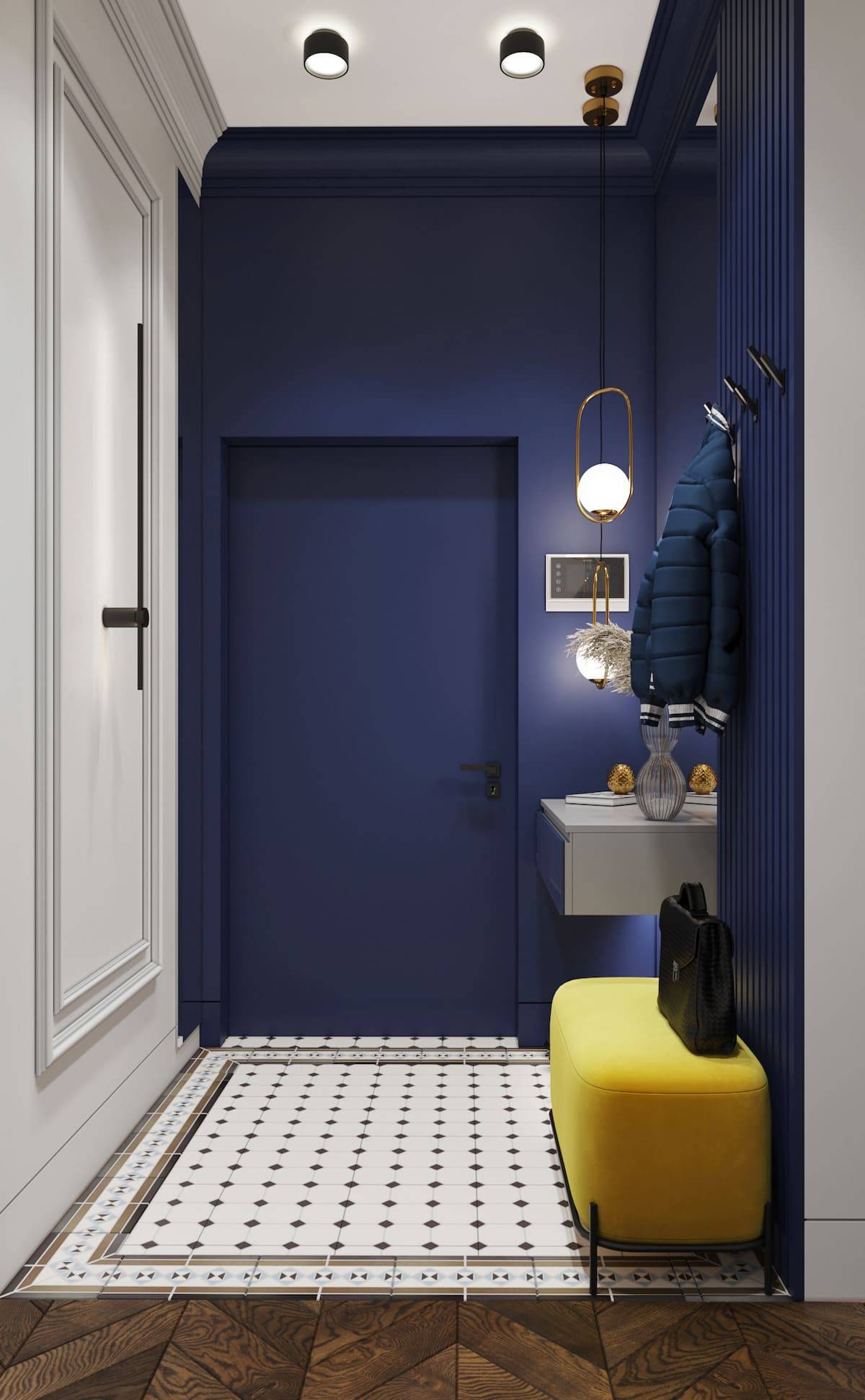 Прихожие с яркими деталями выглядят по-разному и элегантно, ведь современность идеально подходит для воплощения смелых решений. Насыщенные оттенки можно сочетать с нейтральными цветами или наоборот — создавать контраст с другими запоминающимися цветами.