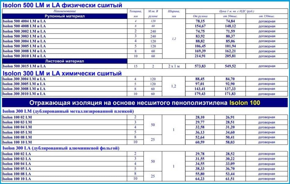 На рынке реализуется различных видов Фольгоизолон цена на которой зависит от его параметров — толщины пенополиэтилена, отражающей пленки из алюминиевой фольги, технологии изготовления, стоимость некоторых марок:
