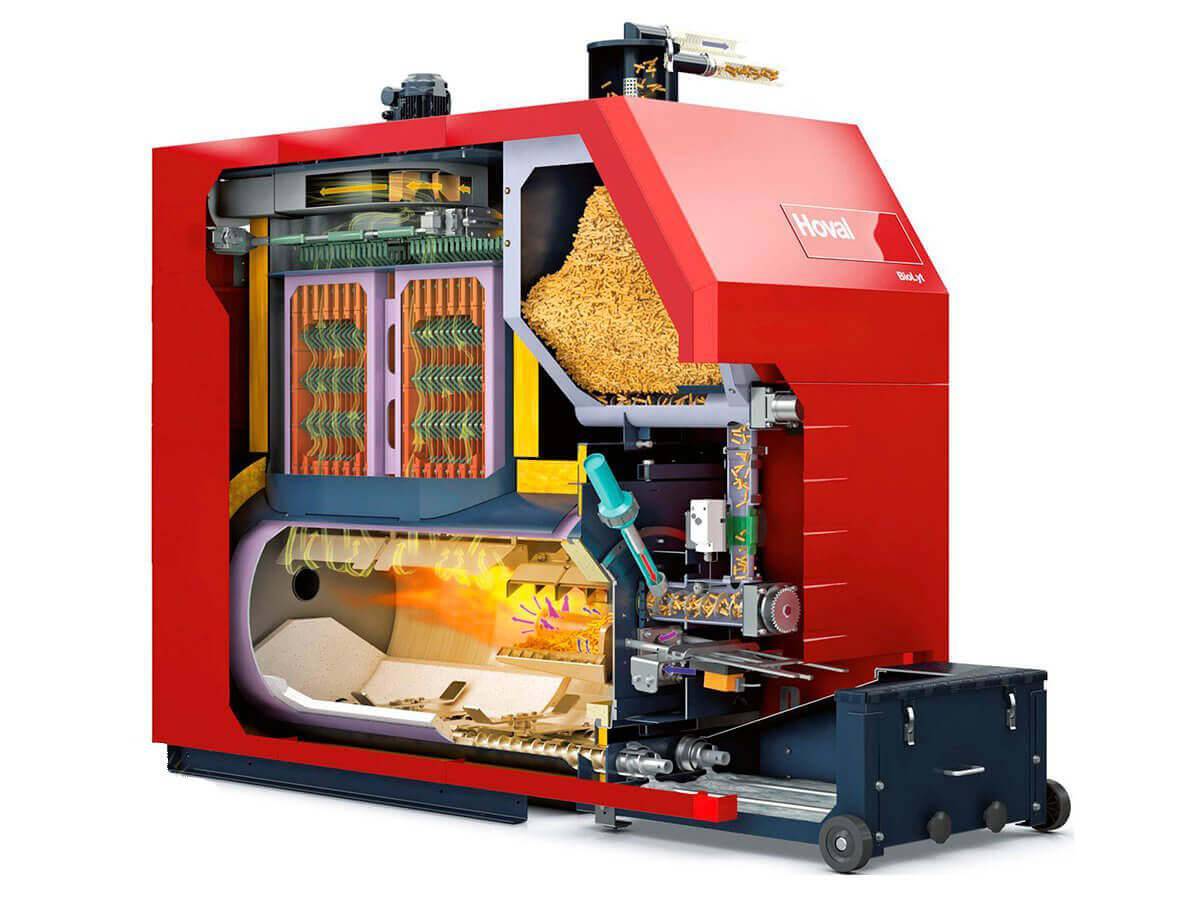 - древесные гранулы, сгорая, нагревают теплоноситель.