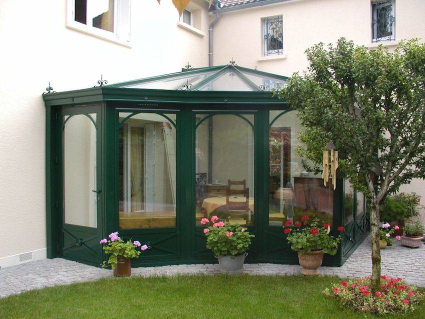 А пристройка закрытая стеклом является универсальной, она впишется как в дизайн домов из камня, кирпича так и домов из древесины. Для каменных построек хорошо подходит дизайн с коваными деталями.