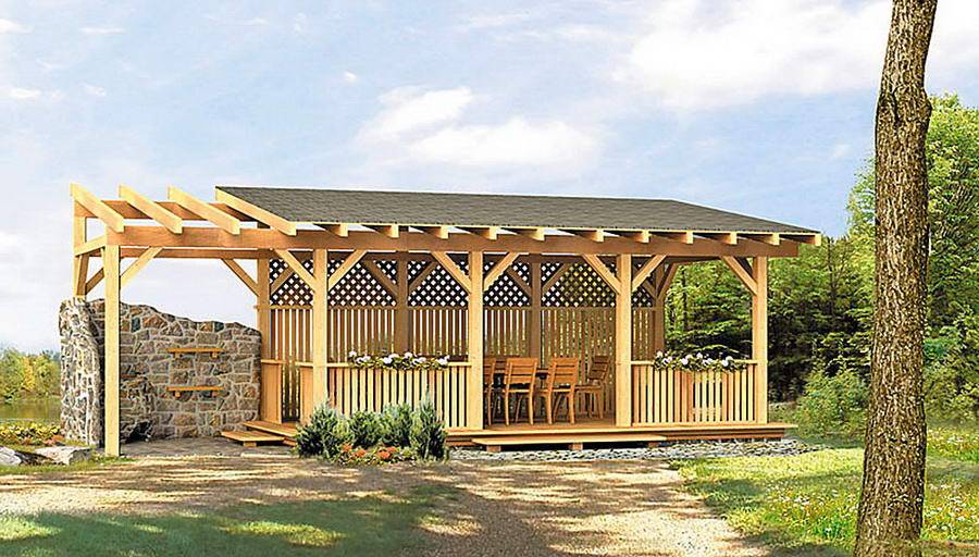 Беседка, пристроенная к дому, может быть выполнена в нескольких вариантах.