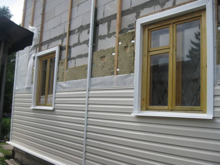 Наружная облицовка должна защищать дом от воздействия внешней среды, особенно влаги. Ее паропроницаемость должна быть выше, чем у пенобетона. Наиболее распространены варианты – сайдинг, блокхаус, металлосайдинг. В пространство обрешетки укладывают минеральную вату или эковату, но не пенопласт.