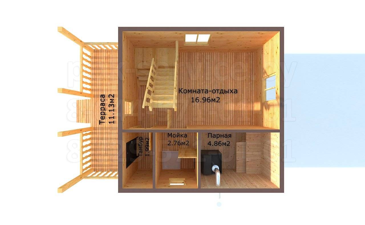 Пример планировки бани 3 на 3 внутри показан на фото.