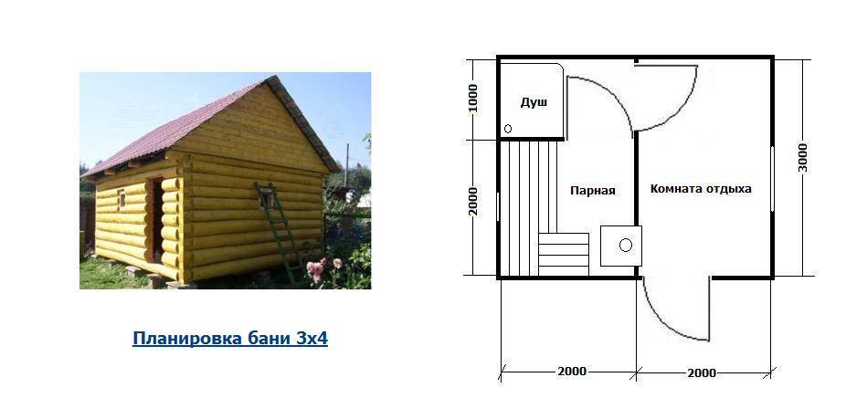 Внутренне пространство мини-бани используется с максимальной эргономичностью. Его разделяют на две части: парную и предбанник, где можно также оборудовать комнату для отдыха. Бани с размерами 3х4 м идеально подходят для мытья двух человек, для троих, к сожалению, слишком мало пространства.