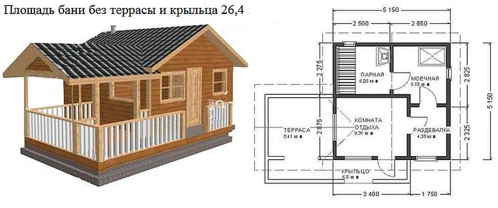 Можно совместить его с крыльцом. Проект бани с крыльцом — компактный и удобный вариант. Тогда площадь увеличится до 6 м.кв.