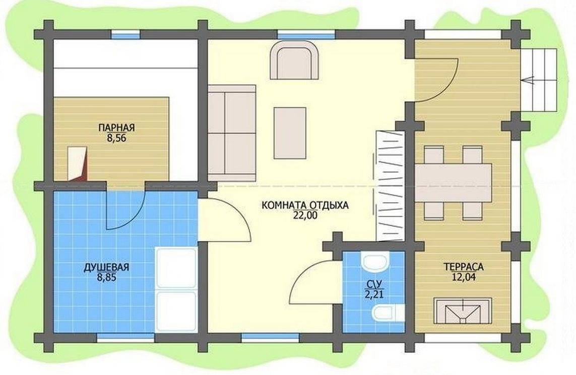Сегодня вместо него устраивают комнату отдыха. Она имеет общие капитальные стены с основными помещениями бани. Взяв на себя функции предбанника, это помещение еще и играет роль места, где можно отдохнуть, посидеть за столом, выпить чай и поговорить с друзьями. В летнее время из комнаты отдыха можно выйти и на террасу, чтобы насладиться свежим дуновением воздуха после жаркой парной. Не удивительно, что проекты бани с комнатой отдыха и террасой пользуются наибольшей популярностью.