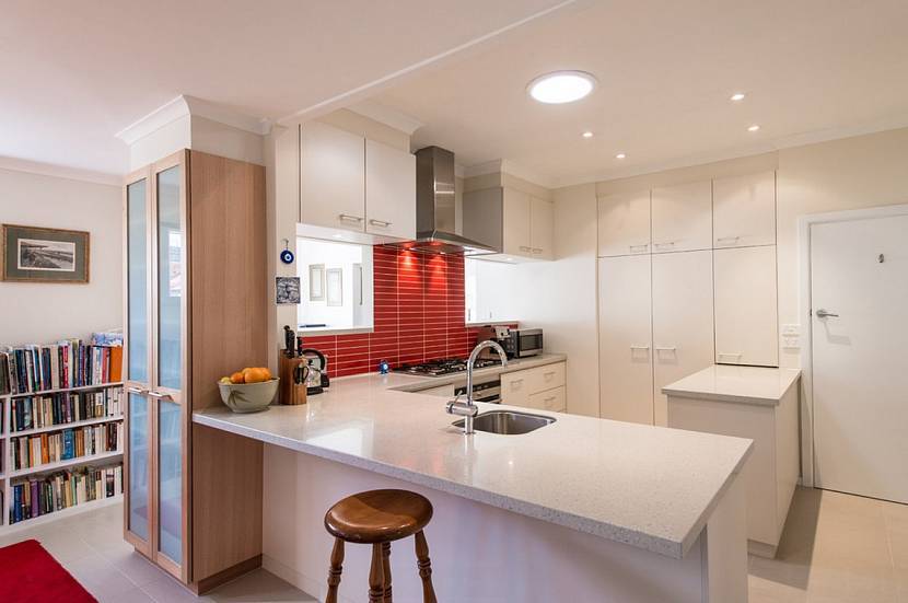 - Чтобы обстановка не выглядела монотонной, ее разнообразят вкраплениями ярких цветов — обивкой мебели, коллекцией чашек, контрастной столешницей. Плохое решение для маленькой комнаты — цветной потолок, уменьшающее ее высоту.