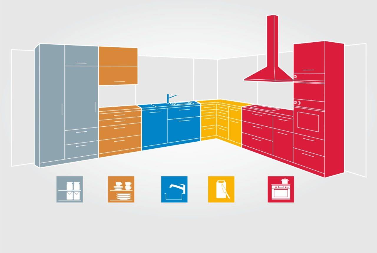 Деятельность человека на кухне предполагает выполнение им ряда технологических процессов: хранение продуктов питание, их мытье, разделка и приготовление. Поэтому основными элементами кухни являются холодильник, мойка и плита, которые образуют, так называемый, рабочий треугольник,
