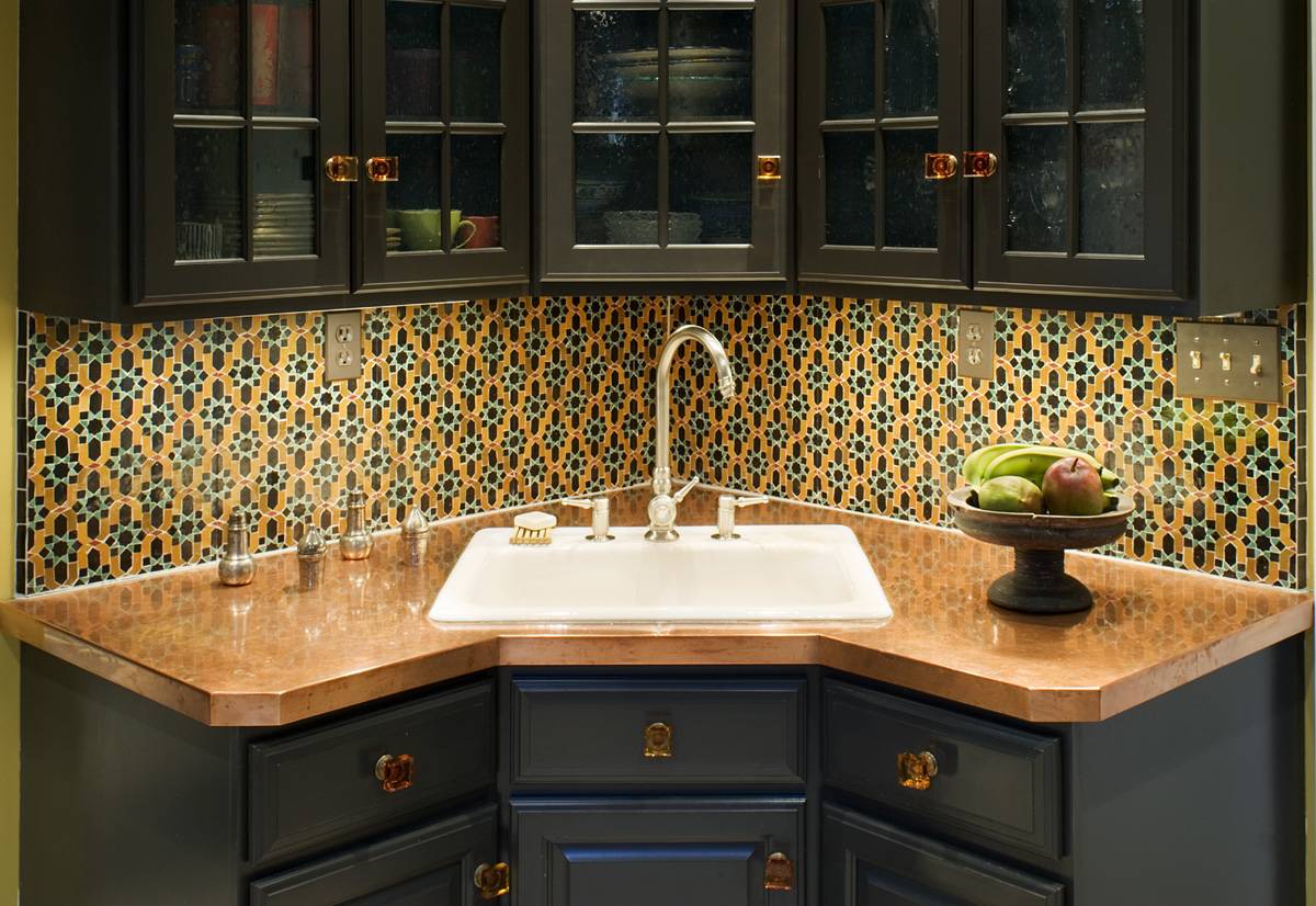 Популярностью пользуется угловое размещение мойки. Они обеспечивают удобство мытья посуды или продуктов. А также такое расположение выгодно с экономической стороны, так как обычно стояк располагается именно в углу помещения.