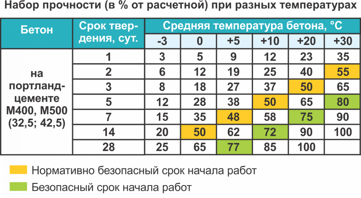 Чем ниже температура по сравнению с оптимальной, тем медленнее идут процессы набора прочности; при температуре ниже +5°С они почти прекращаются
