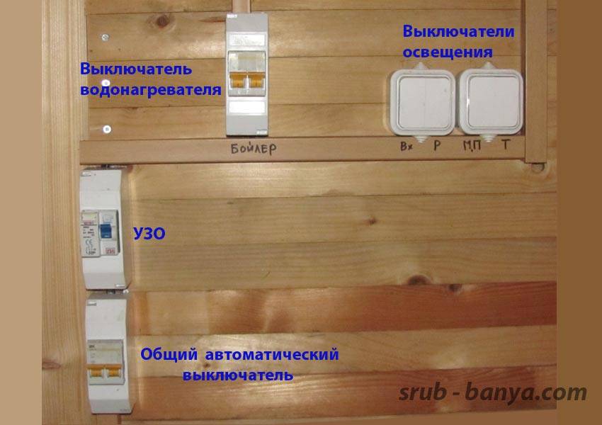 Электрические приборы во входном тамбуре. 2. Схема электрооборудования достаточно проста. Кабель, который подводит электричество в баню, подключается к общему автоматическому выключателю, который срабатывает на короткое замыкание и имеет номинал 16А или 25А. Далее подключается устройство защитного отключения – УЗО.