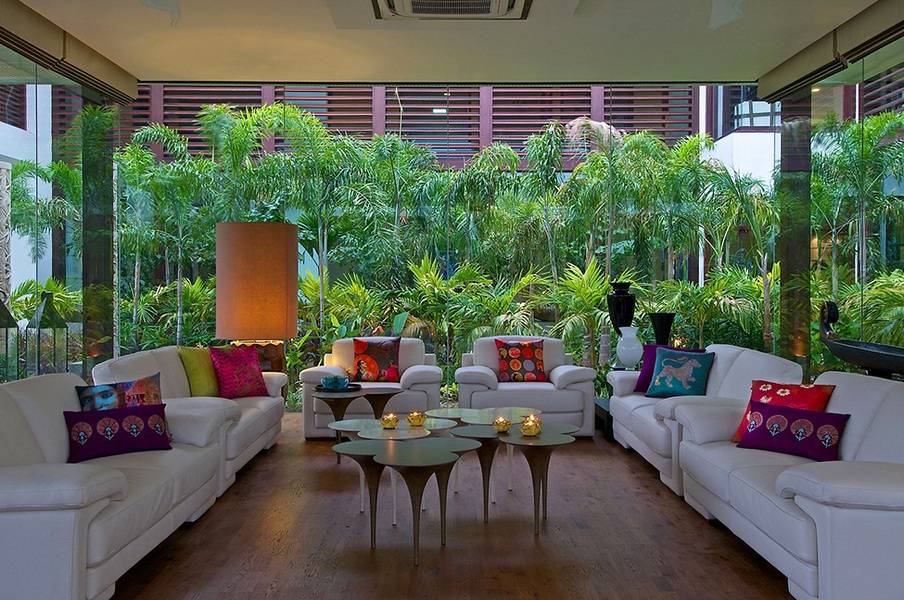 - Если вы хотите обеспечить максимальную обзорность посредством установки безрамных или панорамных систем, позаботьтесь о защите помещения от посторонних глаз: жалюзи, шторы и высокие комнатные растения помогут с успехом выполнить эту задачу.