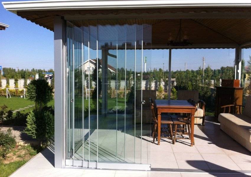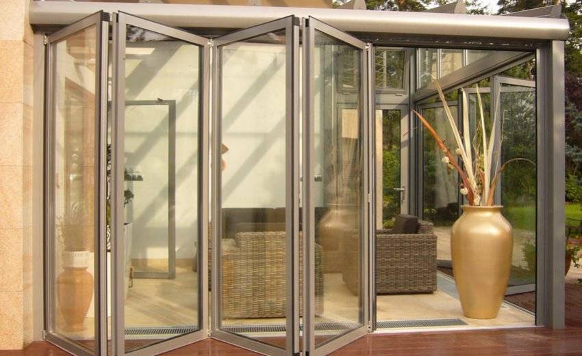 Эта система остекления в народе носит название «гармошка», так как состоит она из нескольких створок, которые складываются, позволяя открыть проём на всю ширину. Плюсами данной конструкции можно считать способность зонирования пространства, хорошую тепло- и звукоизоляцию, возможность пропускать солнечные лучи, система выполнена из разных материалов (ПВХ или алюминий), распахивание одной или двух створок.