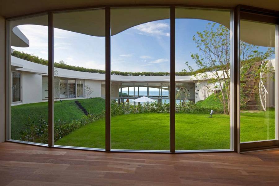 - Террасы с окнами отличаются от основной конструкции дома расположением последних на достаточно небольшой высоте от пола (порядка 30—60 см); все чаще устраиваются стеклянные стены.