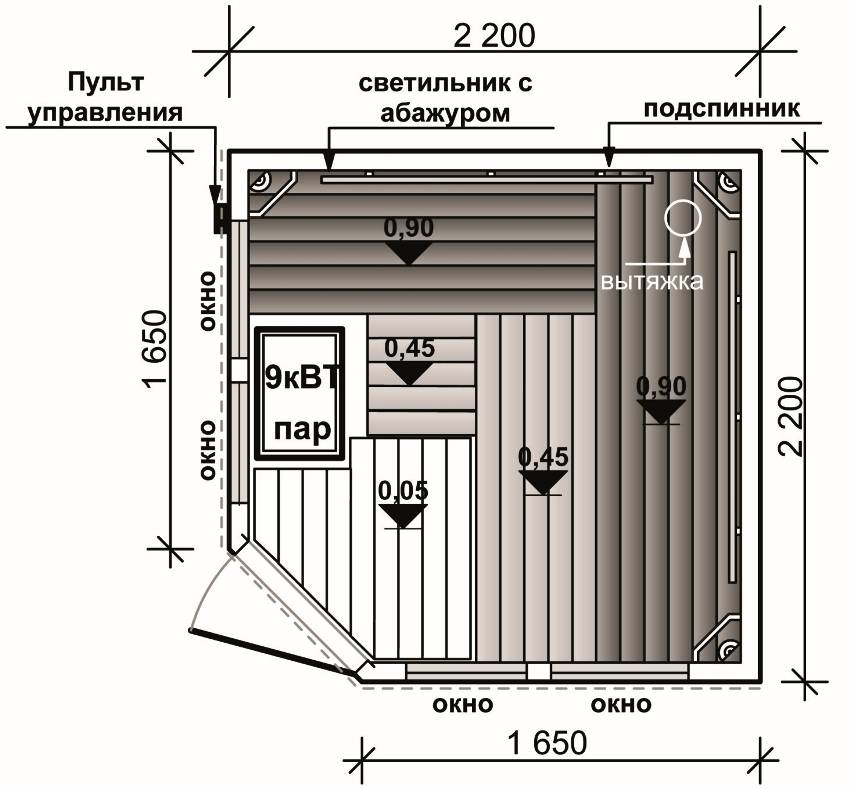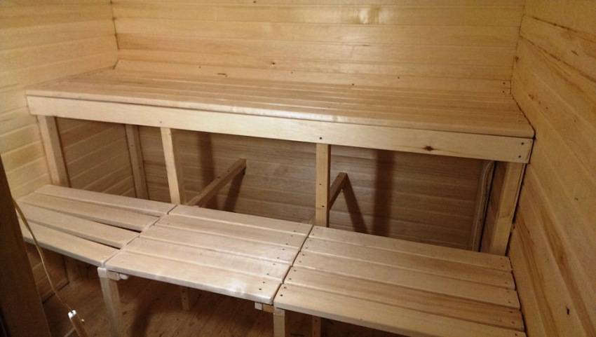 Так вот, финны бы сделали три яруса полков с шириной 40 см на «ступеньку». Следовательно, в глубину их полок занимал бы всего лишь 3х40=120 см. Длина его бы варьировалась в зависимости от габаритов помещения и количества людей в парной.