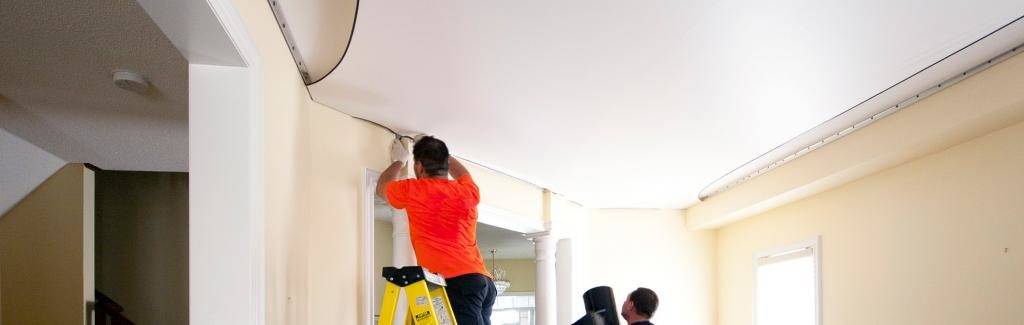 При установке плёнки на основе ПВХ используют термопушки, для работы с тканевым потолком достаточно только комплектующих, которые устанавливают по периметру. Увеличить темп работ помогает применение гарпунного крепежа. Если ширина небольшая, то придётся использовать сварку. Швы негативно влияют на эстетические характеристики, снижают прочность. Лучше выбирать коллекции с шириной, которая позволит обойтись без швов. Это сократит время установки, окажет положительное влияние на качество ремонта.