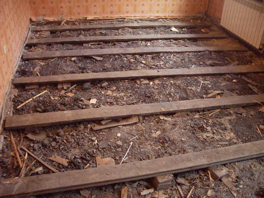 Сначала снимите доски, использовать можно что угодно, хоть топор. Затем удалите лаги. Все что осталось от старого пола нужно выкинуть без исключения: лаги, доски, гвозди, все несите на помойку. Эти материалы уже отслужили свое, и использовать их вперемешку с новыми недопустимо.