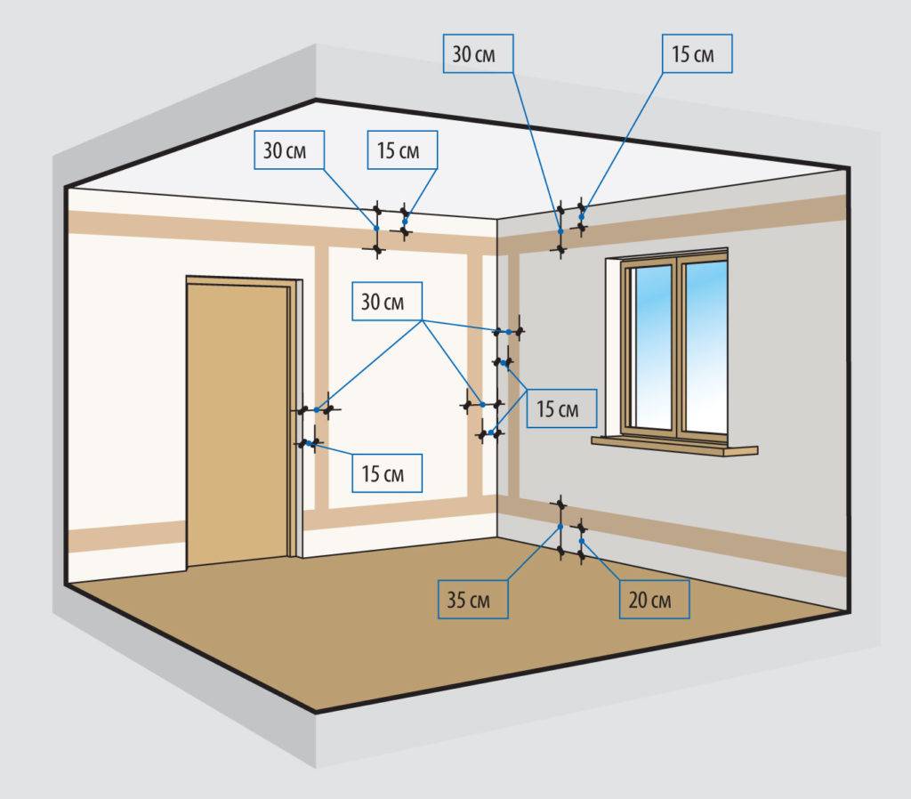 Из этого набора изготавливается раствор для будущей стяжки. Соотношение цемента и песка должно составлять 1 к 4. Количество воды равно количеству цемента. После замеса смесь накладывают слоем в 4-5 сантиметров, ориентируясь при этом по маякам – маркерам.