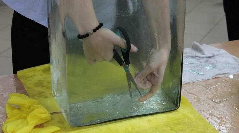 Не существует идеального способа как обрезать стекло без стеклореза. Практически каждый из методов является компромиссом между идеальной ровной линией реза и скоростью работы. Ножницы позволяют разделить стеклянное полотно максимально быстро. Для процедуры потребуется острые ножницы и тазик с водой. Стекло помещают в воду и быстрыми движениями разделяют его на части.
