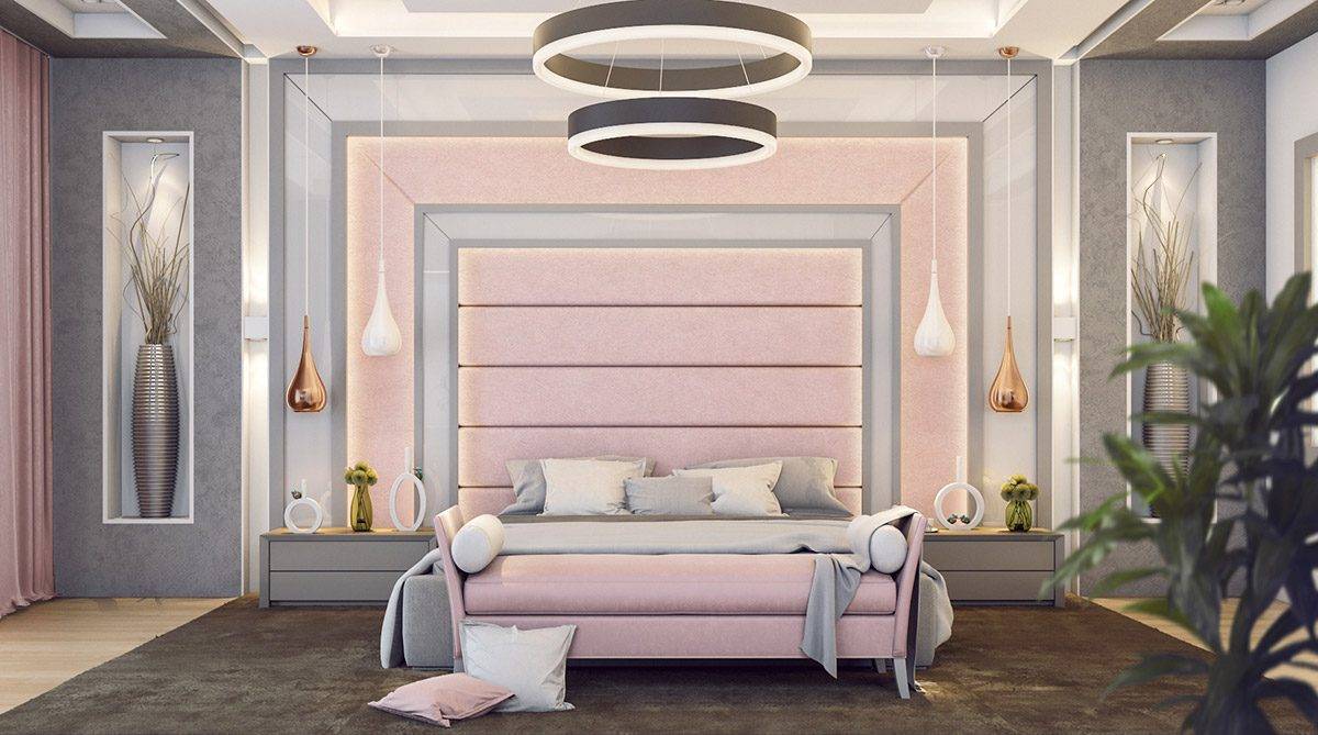 Наиболее спокойным оформлением будет в серо-розовой или бежево-розовой палитре. Для гармоничного образа комнаты, оттенок лучше использовать в деталях, например отделка мебели, портьеры или фрагменты стены.