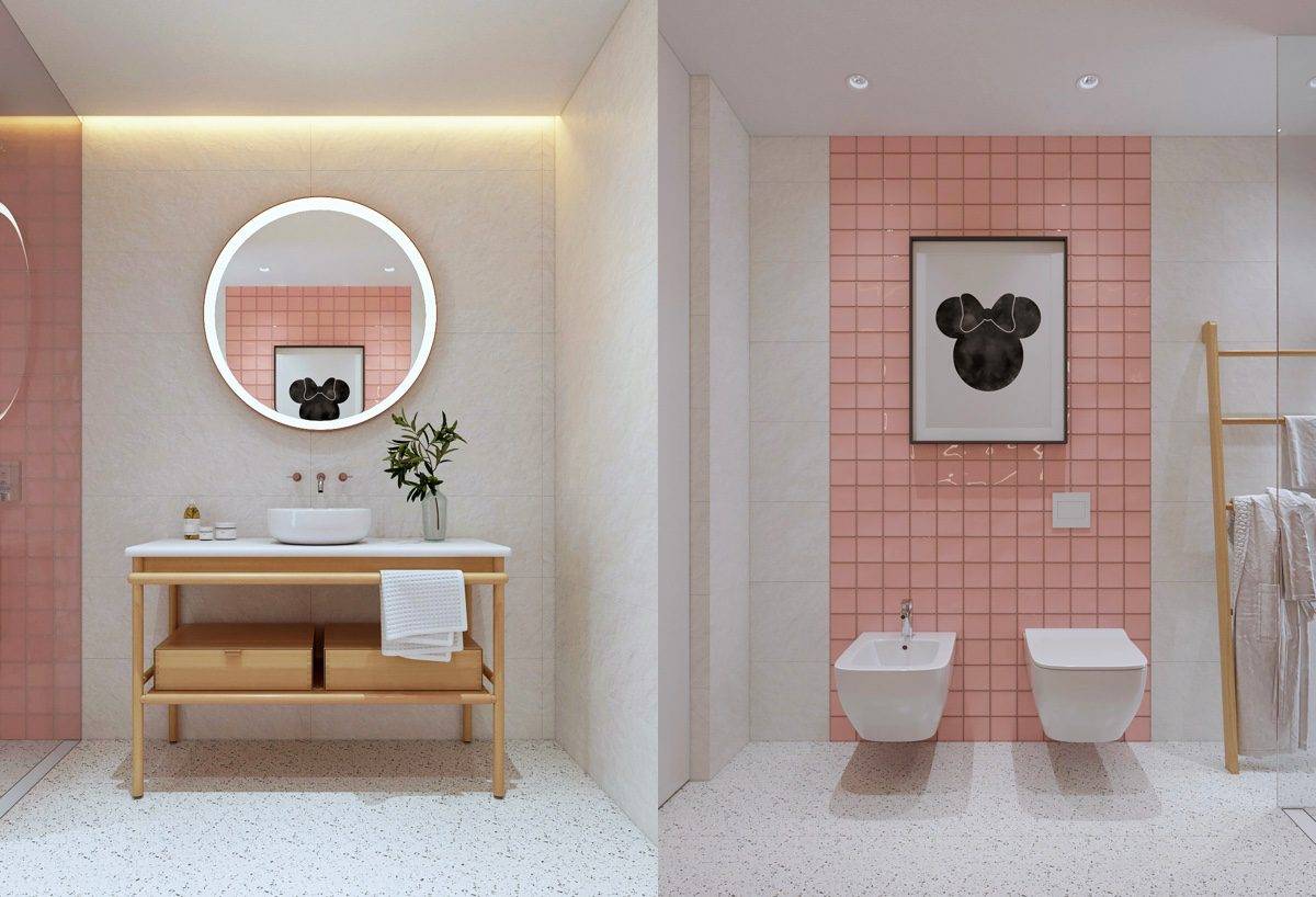 Нежно-розовый оттенок украсит классический интерьер, а вставки с рисунками или узорами поддержат тематическое направление комнаты. Яркие оттенки можно использовать частично в виде отделки одной из стен в качестве акцентной или как самостоятельные элементы интерьера. Оригинально смотрится винтажная розовая ванна.