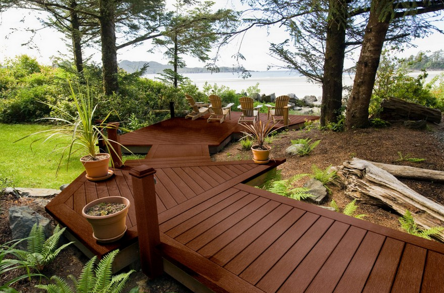 Садовый паркет. Его второе название – «декинг», переводится как «палуба». Дорожка из декинга может быть продолжением террасы или зоны барбекю. Из садового паркета можно соорудить нечто интересное – способов его укладки много. Например, можно уложить плиты со смещением, а между ними насыпать мелкую гальку, окрашенную в какой-нибудь яркий цвет.
