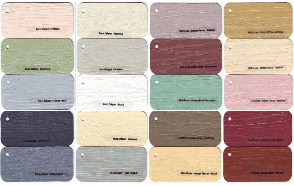 Материалы различаются широким ассортиментом цветов, которые бывают глубокими насыщенными, нежными пастельными или создающими имитацию настоящей древесины. Доборные части, первоначальные и соединительные планки для сайдинга, как правило, белые. Но при желании клиента комплектующие могут изготовить в любом цвете.