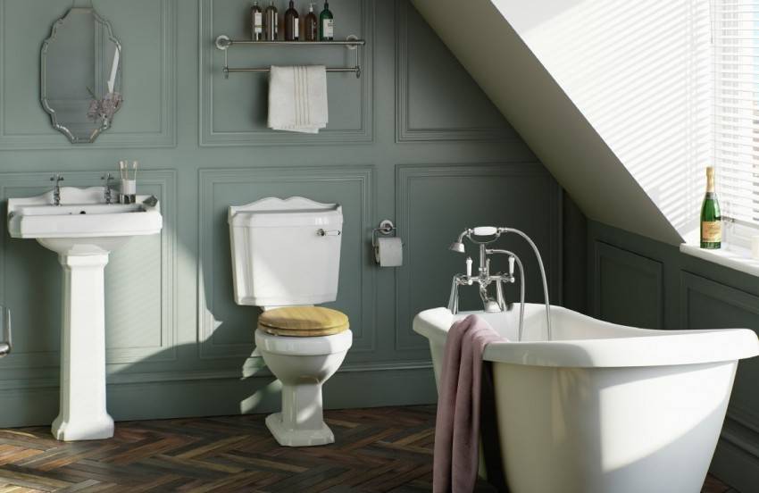 Ванна, раковина, биде, унитаз должны быть классическими, лучше всего – овальными. Никаких прямых углов, обязательно наличие бортиков. Чем более традиционна форма – тем лучше. Чаша ванной может стоять обособленно, на красивых ножках, отлитых из чугуна. Кроме эмалированных, этот стиль признает также ванны из камня и дерева – это наиболее дорогой, но и наиболее эффектный вариант.