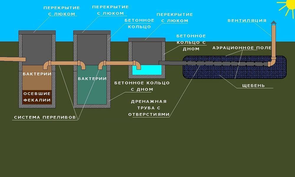 - усложнённая конструкция, предполагающая установку нескольких камер, систем перелива и фильтрации;