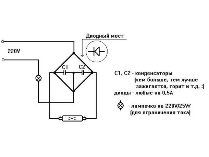Схема бездроссельного подключения ЛДС Чтобы ненадолго продлить работу сгоревшего светового прибора, существует вариант, при котором возможно подключение лампы дневного света без дросселя и стартера (схема подключения на рисунке). Он предусматривает использование умножителей напряжения.
