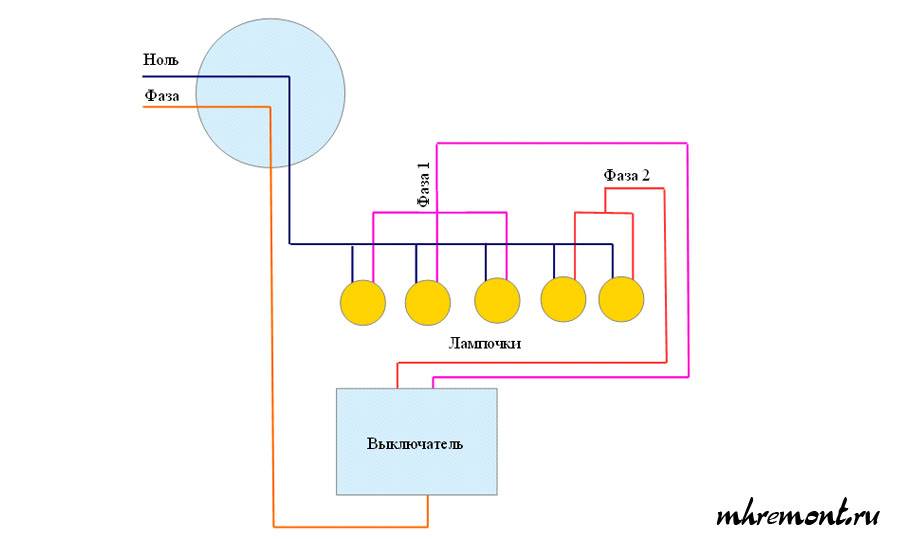 Если от выключателя отходит только один фазный провод, то для включения отдельных групп ламп придется добавлять провода. Обойтись без этого можно только если выбрать люстру с пультом управления. Встроенный в неё блок управления запитывается от одного провода и позволяет отдельно включать различное количество ламп.
