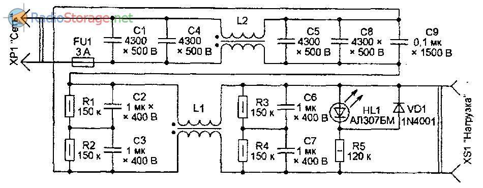 Рис. 14. Схема помехоподавляющего сетевого фильтра.