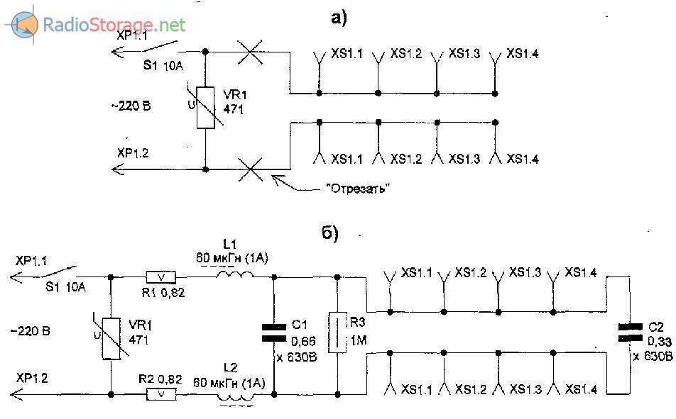 На исходной схеме (рис.11а) S1 -токовый размыкатель, VR1 – варистор типа 471 (числом кодируется максимальное напряжение, а от диаметра зависит максимальная энергия подавляемого импульса).