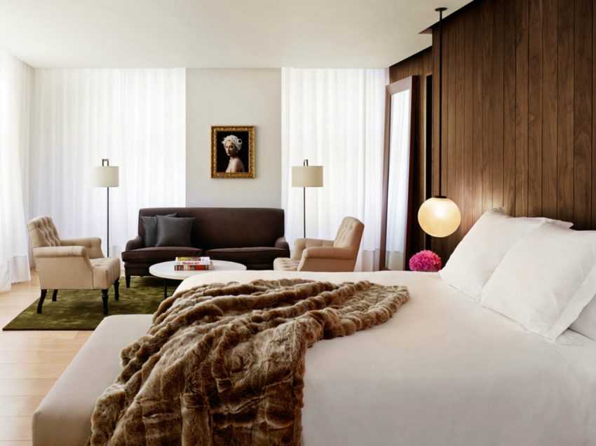 Самый удачный вариант для узкой комнаты – поставить кровать вдоль стены. Если помещение просторное, у стены оказывается только изголовье спального места, а по бокам размещаются тумбочки.