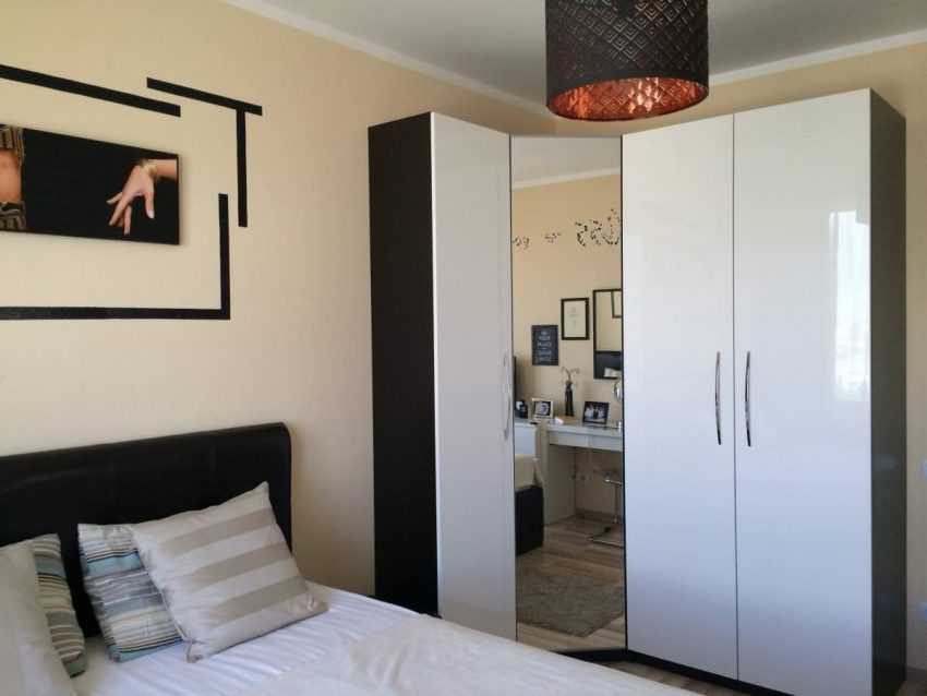 - Форма аксессуара. Для небольших по площади помещений отлично подойдет угловой шкаф, шифоньер модульной сборки. Для оптимальной покупки мебели следует предварительно произвести замеры имеющейся площади в спальне, чтобы не ошибиться с габаритами шкафа.