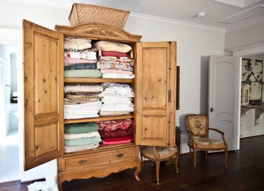- Широкие полки с большой высотой, расположенные в верхних частях шкафов, являются наиболее подходящими для хранения пледов, одеял и постельного белья. Но не стоит сваливать все в одно отделение, лучше разделить изделия из шерсти и хлопка, храня их на разных полках.