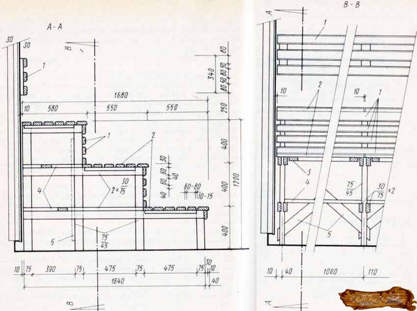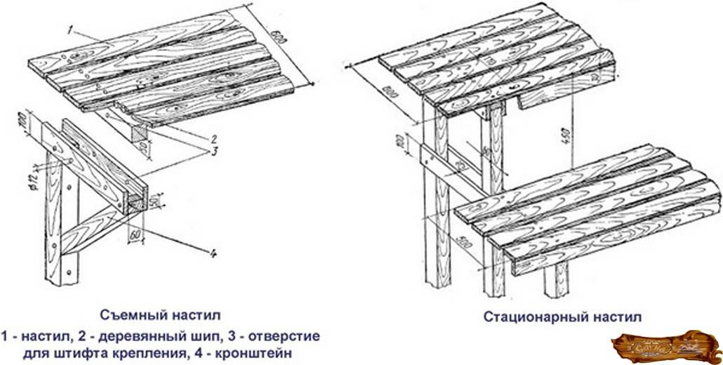 - Сидения (настилы) изготавливайте из досок примерно 20×120 мм, их длина должна соответствовать длине стены.