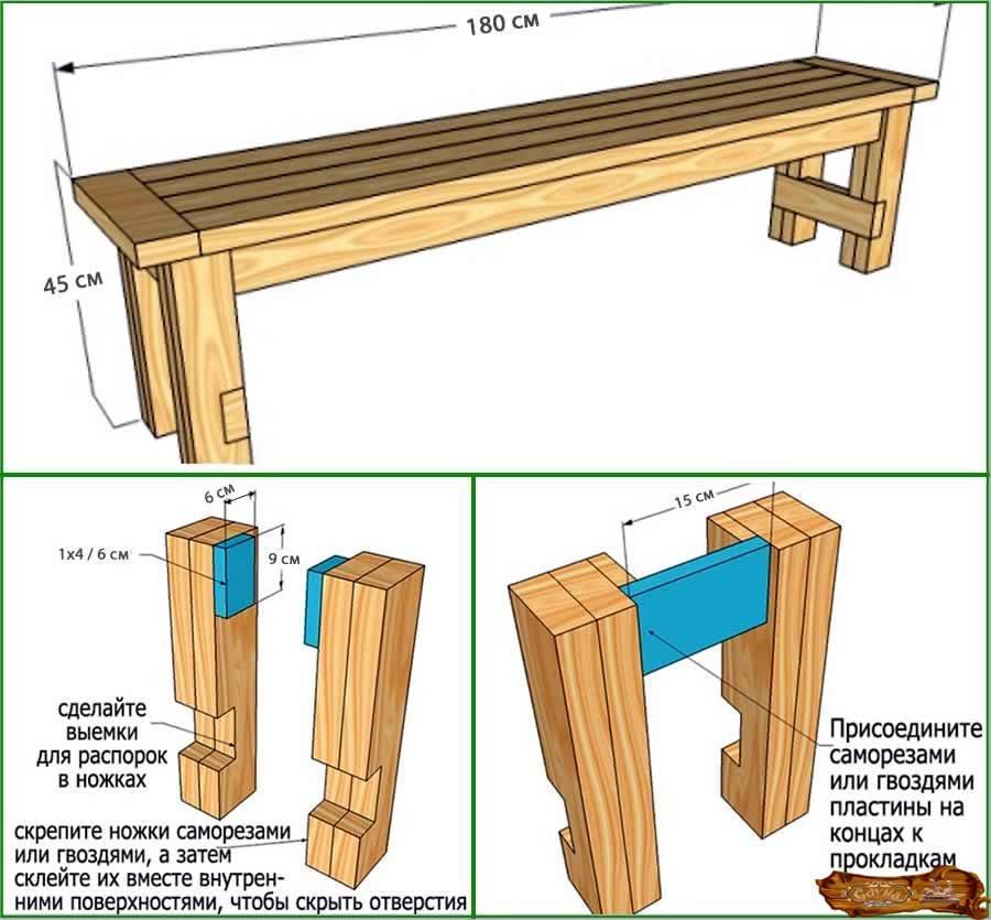Решая сделать лавку в баню своими руками чертежи самому делать не обязательно. Схема действий довольно проста, и можно ограничиться приведенной ниже подробной инструкцией.