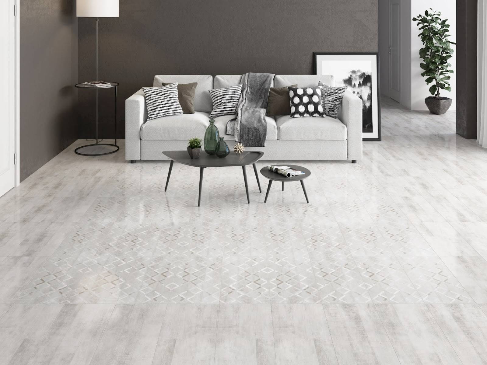 Гигиеничные и прочные материалы. В скандинавских домах нет ковров от стены до стены или линолеума. Дерево выглядит хорошо, но стоит дорого, а в уходе требует особого внимания. Современное решение — керамогранит. Он может легко имитировать натуральные материалы: дерево и камень, но красив и сам по себе. Не боится влаги, прост в уборке, выдерживает активную нагрузку.