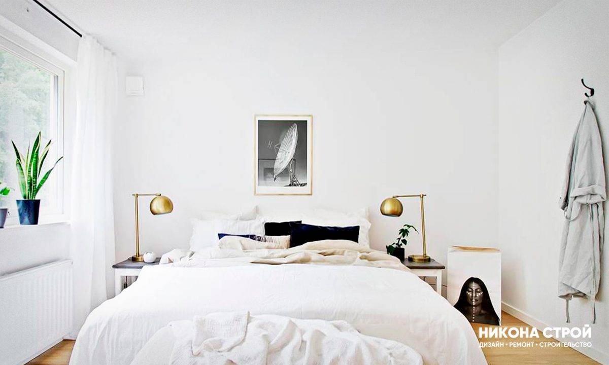 Белый цвет является традиционным для скандинавского интерьера и часто используется как базовый для покраски стен в спальне и отделки других поверхностей.
