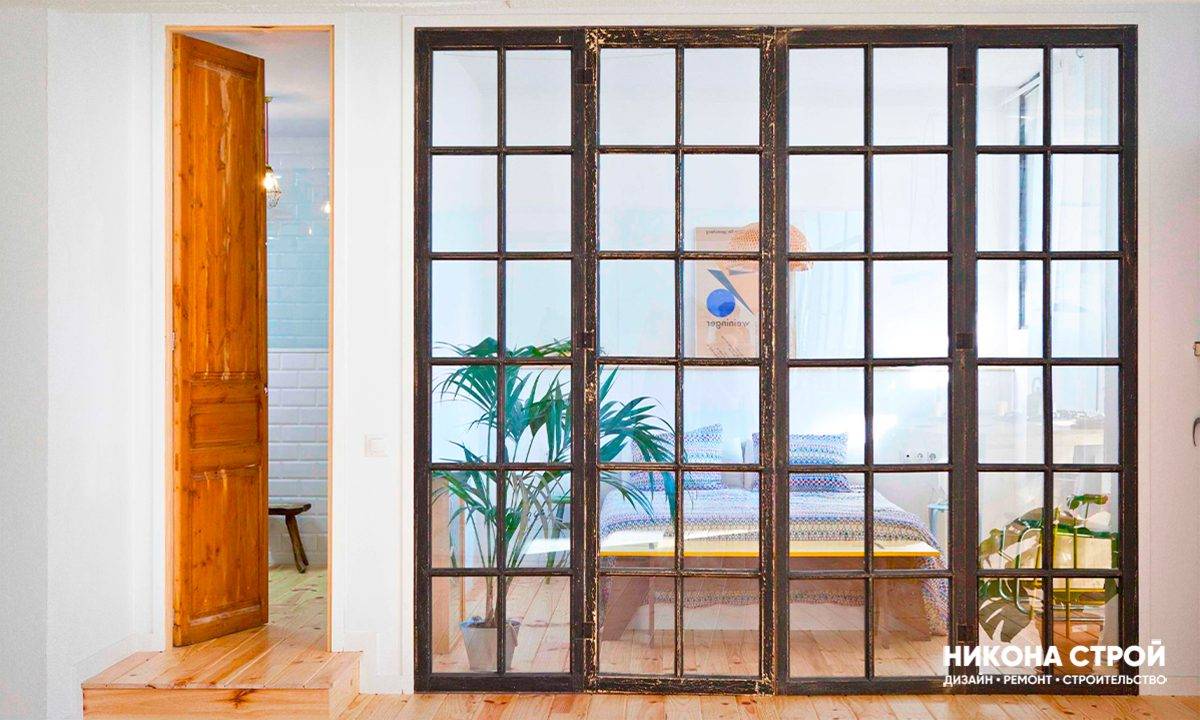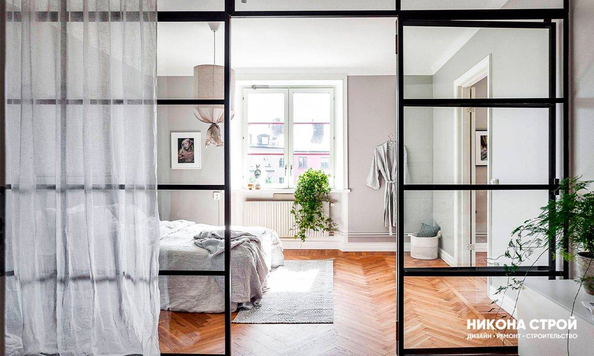 Вход в комнату оформляется большой раздвижной, лучше всего стеклянной дверью, которую при необходимости можно занавесить шторой. Тяжелые шкафы часто заменяются открытыми гардеробными. В целом, сканди-спальня оформляется преимущественно по типу студии, объединяясь с ванной, будуаром, гостиной или кабинетом. При этом зонирование выполняется весьма условно – с помощью небольшой перегородки, арки, предметов мебели или стеклянной ширмы. Все это направлено на максимальное обеспечение дневным светом всех помещений и создание визуального простора.