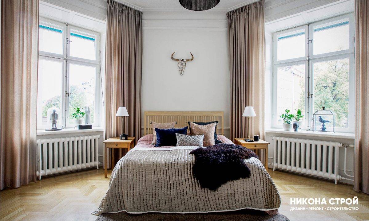Дефицитный для северных регионов солнечный свет в Скандинавии предпочитают не уменьшать даже легкими занавесками, а тем более плотными портьерами. Поэтому оконные проемы делаются максимально большими и зачастую ничем не занавешиваются. Но из-за специфичности спального помещения вечером окна должны быть закрытыми. Для этого используются такие шторы, которые можно полностью убрать или раздвинуть на день. Хорошим выбором станут рулонные, римские или раздвижные модели. Полностью исключаются жалюзи, которые даже в открытом состоянии уменьшают доступ света.