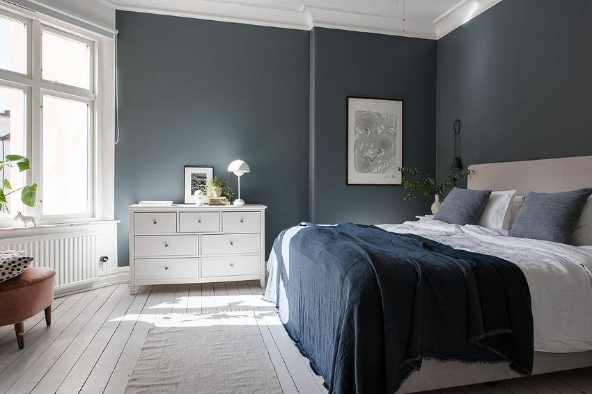 Привязка именно к белым стенам и мебели светлых тонов уже не является обязательной. Сейчас в современных скандинавских интерьерах всё чаще можно встретить такие сложные оттенки как индиго, винный, изумрудный и тд. Также стали использовать и тёмные цвета в качестве основного фона – тёмно-серый и даже чёрный. Неудивительно будет встретить в скандинавской спальне яркие акценты в виде жёлтых, брусничных и зелёных тонов. Таким образом, можно смело утверждать, что в настоящее время дизайн сканди-спальни не привязан к определённой цветовой гамме.