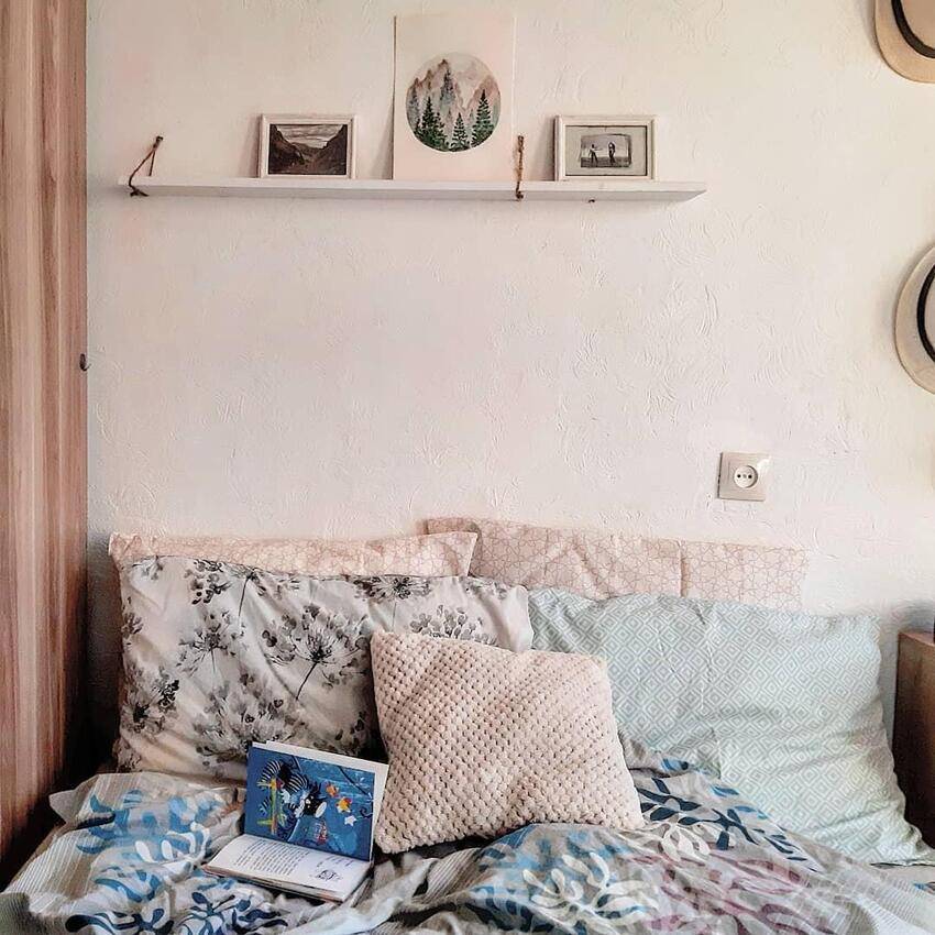 Поверхности потолков, стен и пола – это, своего рода, фон, чистый лист, на котором можно создавать собственный шедевр. Так что не бойтесь украшать стену картинами, фото и прочим декором. На полу будет уместным пушистый коврик или лоскутная дорожка.