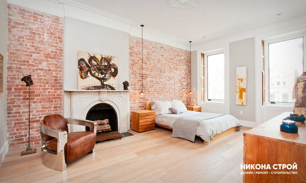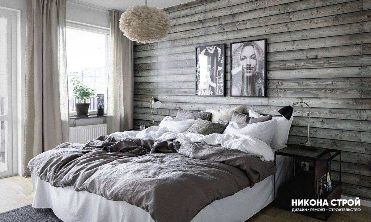 Еще один подходящий вариант – сочетание контрастов. Оно должно быть без резких переходов и слишком выраженных акцентов. Оптимальным решением может стать спальня в скандинавском стиле с деревянной стеной или с отделкой под выбеленную кирпичную кладку. Такую стену обычно оформляют у изголовья или напротив окна. При этом основной цвет может быть белым или любым пастельным. Очень часто в сканди-стиле преобладает серо-голубой тон или легкий беж.