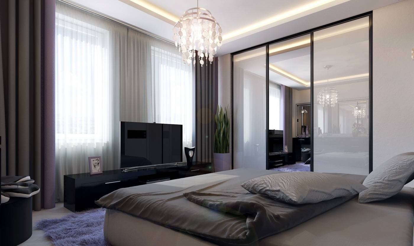 Любители посмотреть перед сном любимый телесериал могут установить в спальную комнату шкаф-купе с телевизором. Сегодня существует множество вариантов такого решения. Телевизор может быть помещён как в отдельную нишу, так и сокрыт за раздвижными дверями.