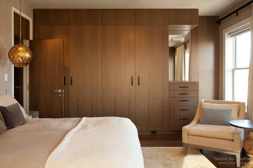 Модели во всю стену – наиболее популярный и универсальный вариант для больших и маленьких спален. Такую конструкцию проще встроить в помещение, она вписывается в любой дизайн интерьера и хорошо экономит пространство. Здесь немаловажным является дизайн дверей.