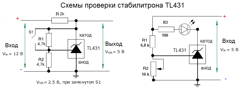 TL431 нельзя проверить с помощью мультиметра, так как это не простой стабилитрон, а интегральная микросхема. Сопротивления между его выводами у разных производителей отличаются. Поэтому, для того чтобы убедится в её исправности обычно собирают простейшие схемы проверки.
