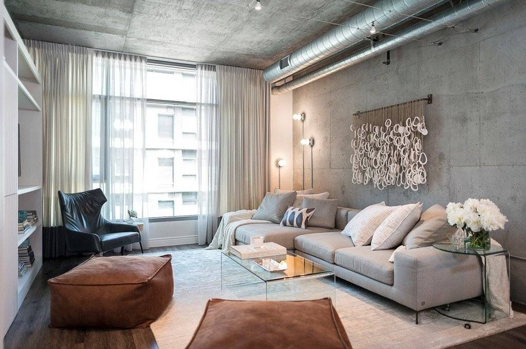 - кирпичная кладка, открытые коммуникации, трубы, голые бетонные поверхности, металлические конструкции;