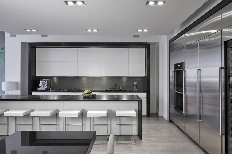 Для остального помещения советуем выбрать точечные светильники. Во-первых, они вполне вписываются в концепцию американского интерьера – ничего лишнего там, где не нужно. Во-вторых, под них удобно делать разводку для зонального освещения.